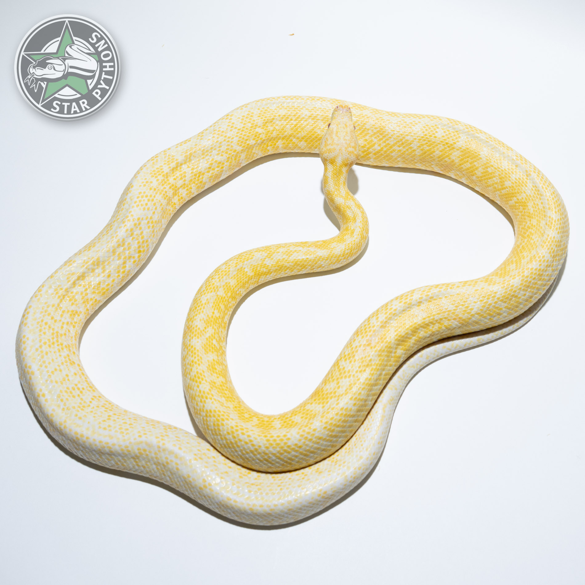 Der Albino Granite kombiniert Darwin Albino (M. s. variegata) mit IJ Granite (M. s. harrisoni) – eine Unterart-übergreifende Designer-Kombination. Da der Albino-Morph Melanin stark reduziert oder vollständig eliminiert, äußert sich die Zeichnungsfragmentierung des Granite hier als weiches Mosaik aus blassgelben und cremefarbenen Clustern auf sauberem Weiß-Gelb-Grund – anstelle der dunklen, texturierten Erscheinung normaler Granite-Tiere. Die Zeichnungsstörung bleibt klar sichtbar; nur die Farbpalette ändert sich. Als Kreuzung zweier Unterarten liegt diese Kombination per Definition außerhalb reiner IJ-Linien.