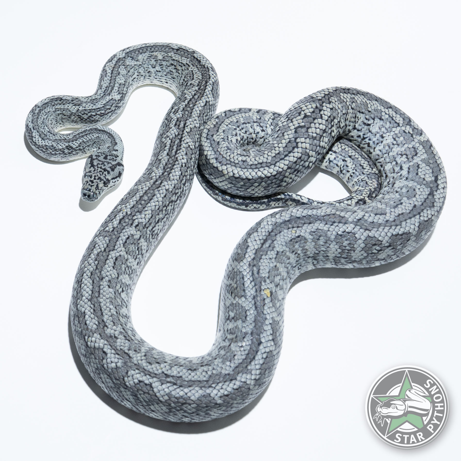 Das hier gezeigte Tier veranschaulicht die natürliche phänotypische Bandbreite innerhalb reiner IJ-Granite-Linien. Sowohl die dunklen Cluster als auch die Grundfarbe sind deutlich heller als beim daneben abgebildeten Axanthic Granite – ein weiches Blaugrau statt Anthrazit – und spiegeln natürliche hypomelanistische Variation innerhalb der harrisoni-Population wider. Es handelt sich um ein populationsbedingtes Pigmentmerkmal, das nicht mit dem Hypo-Morph der Küstenteppichpythons (M. s. mcdowelli) verwechselt werden sollte.